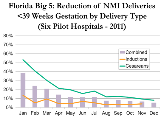 With a seed grant from the MOD to represent Florida, the FPQC focused its efforts on recruiting hospitals and educating practitioners. The FPQC and the MOD partnered to aid the efforts of six Florida hospitals in the Big 5 Hospital QI Project, a year-long pilot test of the “California Maternal Quality Care Collaborative Elimination of Non-Medically Indicated (Elective) Deliveries Before 39 Weeks Gestational Age” toolkit. The goal of the project was to change hospital policies and procedures to avoid scheduling these types of inductions or cesareans. To monitor project outcomes, data were collected on live births that were singleton, Florida residents and “term” pregnancies (370/7 – 386/7) with no medical conditions prior to or during pregnancies.