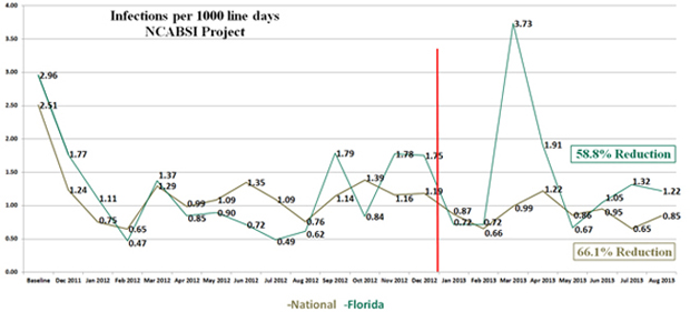 Florida has reduced central line infection by over 58.8% by August 2013. Detailed results between December 2011 and August 2013 indicated that 150 infections were avoided in Florida - saving 18 lives, reducing length of stay by more than 1,199 days and saving over $7.9 million.